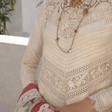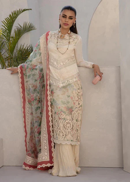 Description: This beautiful ensemble comes with an intricate cutwork neckline, neatly pressed pleats paired with beautiful dori work on a vintage floral print. This never seen before dori work is a treat for the eyes and the duppatta is printed rosettes on organza, embroidered with a Swarovski spray.