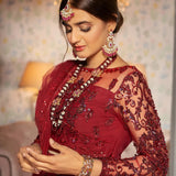 Three piece stitched outfit including Lehenga choli and dupatta. Fabric for Lehenga and choli. is net with shimoz lining attached throughout it with hand embellishment. This outfit is embellished from front, back and sleeves
