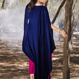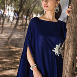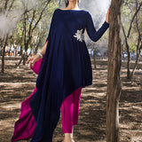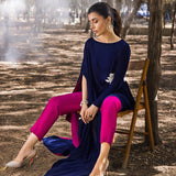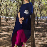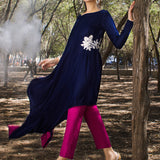 Take a step forward to refresh your wardrobe with this perfect A line kaftan allured with side embellished floral bunch. It comes with contrasting magenta pants that compliments very well.
