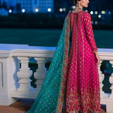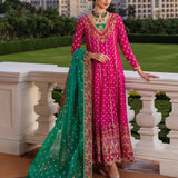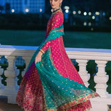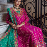 Move gracefully through the space in this pink outfit that evokes the spirit of Renaissance festivities. The embroidered shirt, a modern masterpiece, unfurls like a blooming rose. Its intricate craftsmanship is enhanced by rich gold, rust, and green threads woven with gold lurex. Sparkling with a beautiful hemline, this ensemble, paired with a contrasting emerald dupatta, transforms into a stunning display of elegance and luxury.