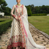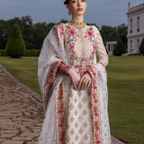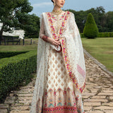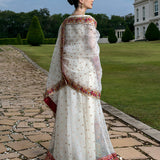 This intricately hand-crafted ensemble is made from pure off-white organza and features thread work in shades of pink, orange, and green on the bodice and borders. Traditional sequin work, combined with intricate machine embroidery, brings the outfit to life. The gorgeous panel, layered over a subtly shimmering fabric, boasts an incredible flair and a flattering silhouette. A cascading pure organza dupatta, embellished with shimmering threadwork, sequins, and an embroidered border, makes this the ideal choice for intimate occasions.