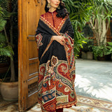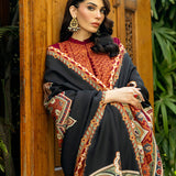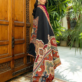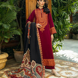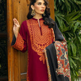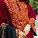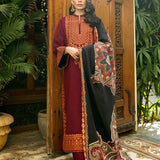 Channel a regal vibe with this unstitched deep maroon ensemble, intricately detailed with rich golden embroidery across the neckline, hem, and cuffs. The delicate patterns evoke a sense of traditional opulence. The luxurious fabric drapes beautifully exuding grace. Paired with a striking black shawl featuring vibrant paisley-inspired designs, this outfit achieves a harmonious balance of boldness and refinement.
